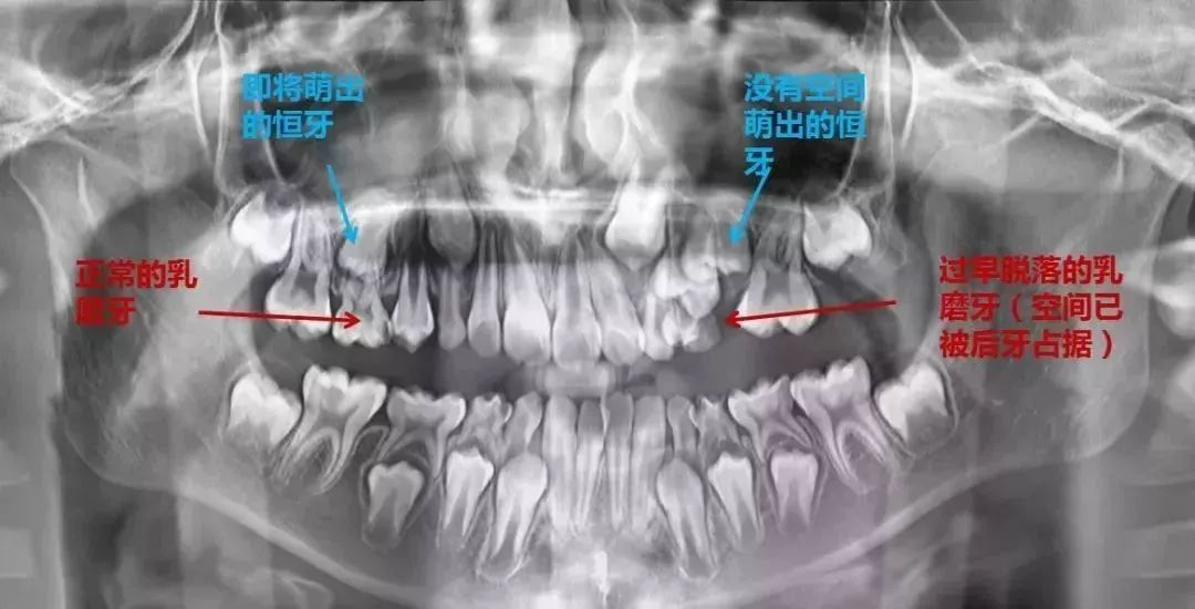 乳牙早掉:牙槽骨缺乏刺激→恒牙萌出空间不足。
