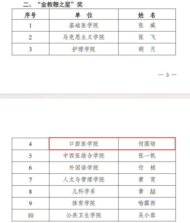 截至当前,口腔医学院累计斩获"金教鞭"奖11人次(聂敏海2015年、袁小平2016年、夏德林2017年、郭玲2018年、徐晓梅2020年、肖金刚2021年、范丽苑2022年、徐晓梅2024年、黎春晖2025年),荣膺"金教鞭之星"奖8人次(黄跃2012年、贺涵2015年、谢乙加2018年、程钎2019年、黄婷2021年、张晓艳2023年、詹聃婷2024年、何圆培2025年)。