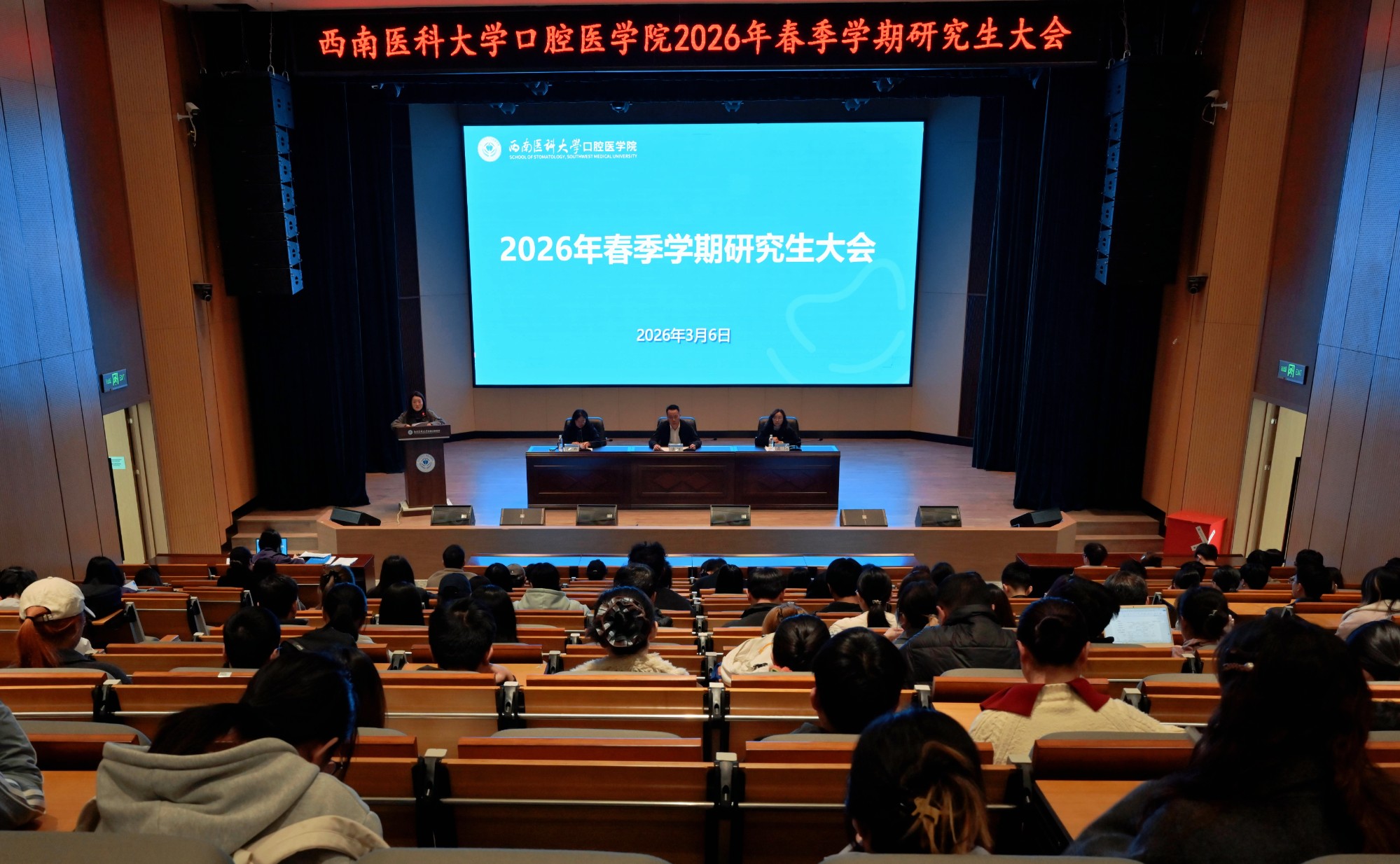 3月6日,口腔医学院2026年春季学期研究生工作会在云峰路院区学术报告厅召开。学院党委书记唐柯同志,党委副书记、纪委书记黄钰同志,党委委员、副院长郭玲同志,学科建设与研究生管理科负责人、研究生辅导员,以及2023级、2024级、2025级全体校本部硕士研究生参加了本次会议。